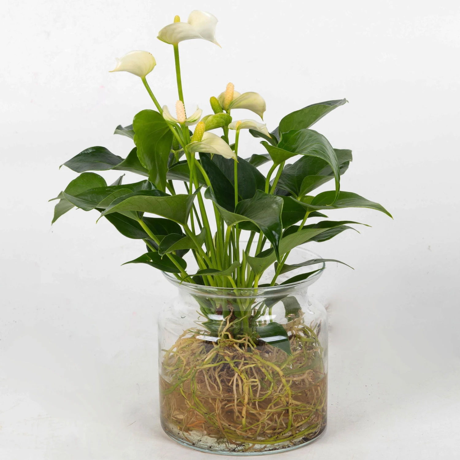Die Pflanze wird wurzelnackt ohne Wasser geliefert, was kein Problem für die Pflanzenqualität darstellt. Stellen Sie Ihre Anthurium ‚Water Roots‘ nach Erhalt einfach in die zugehörige Vase und füllen diese mit frischem Wasser auf.
