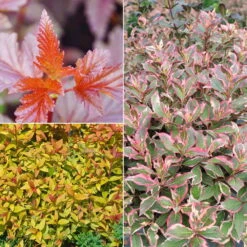 Buntlaubige Gehölze bringen Farbe und Abwechslung in Ihren Garten. Im Gehölz-Set buntlaubig Nr. 2 sind drei Gehölze enthalten, die alle mit einer traumhaften Blattfärbung begeistern: Rotlaubige Blasenspiere ‚Lady in Red’®, Goldlaubige Japan-Spiere und Buntlaubige Weigelie.